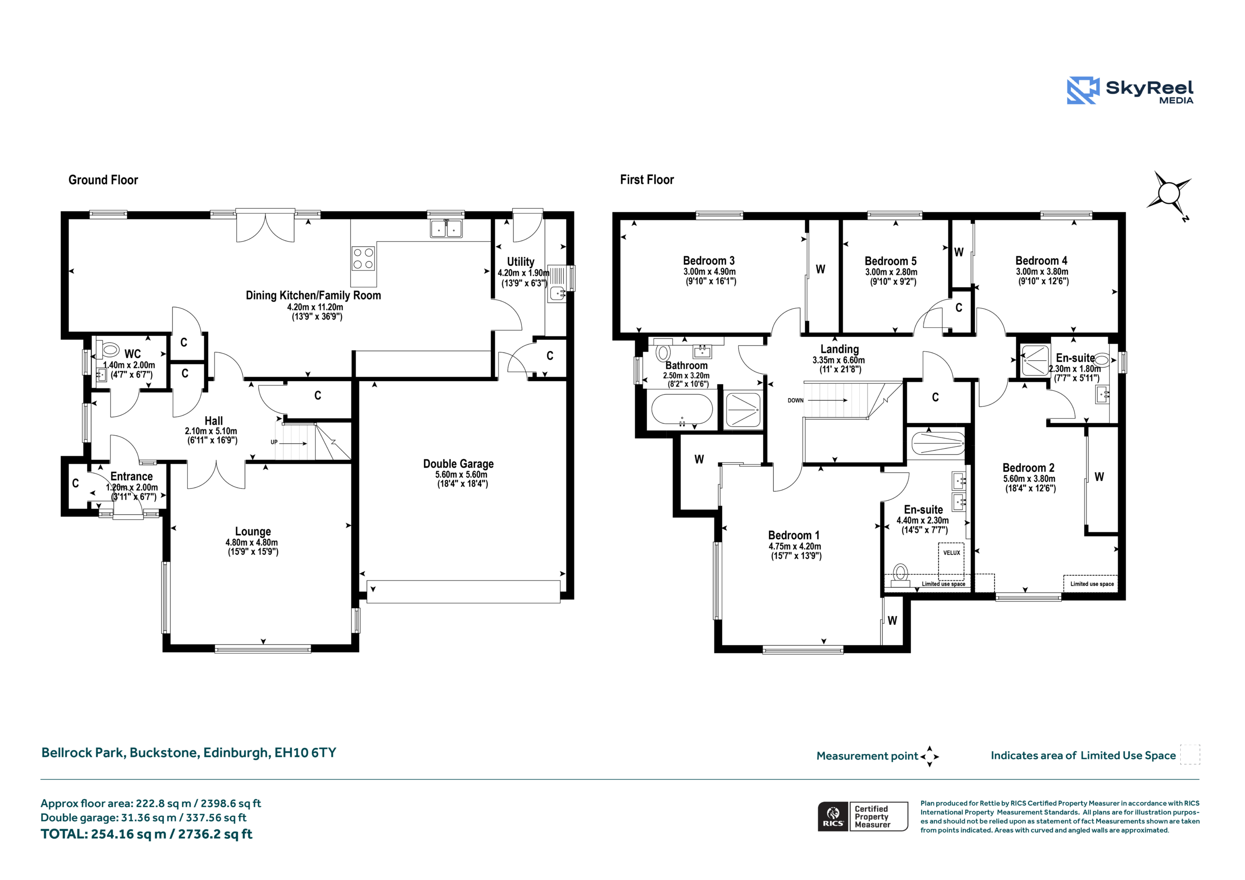 Upstairs, there are five double bedrooms, two with ensuite, and a further family bathroom, all completed to a high specification. The principal bedroom is to the front with large built-in wardrobes and an en suite bathroom with twin sinks. The second bedroom has fitted wardrobes and an en suite shower room. There are three further double bedrooms, all with fitted wardrobes, and a large family bathroom with bath and separate shower cubicle. In addition, there is one spacious shelved storage cupboard off the landing.