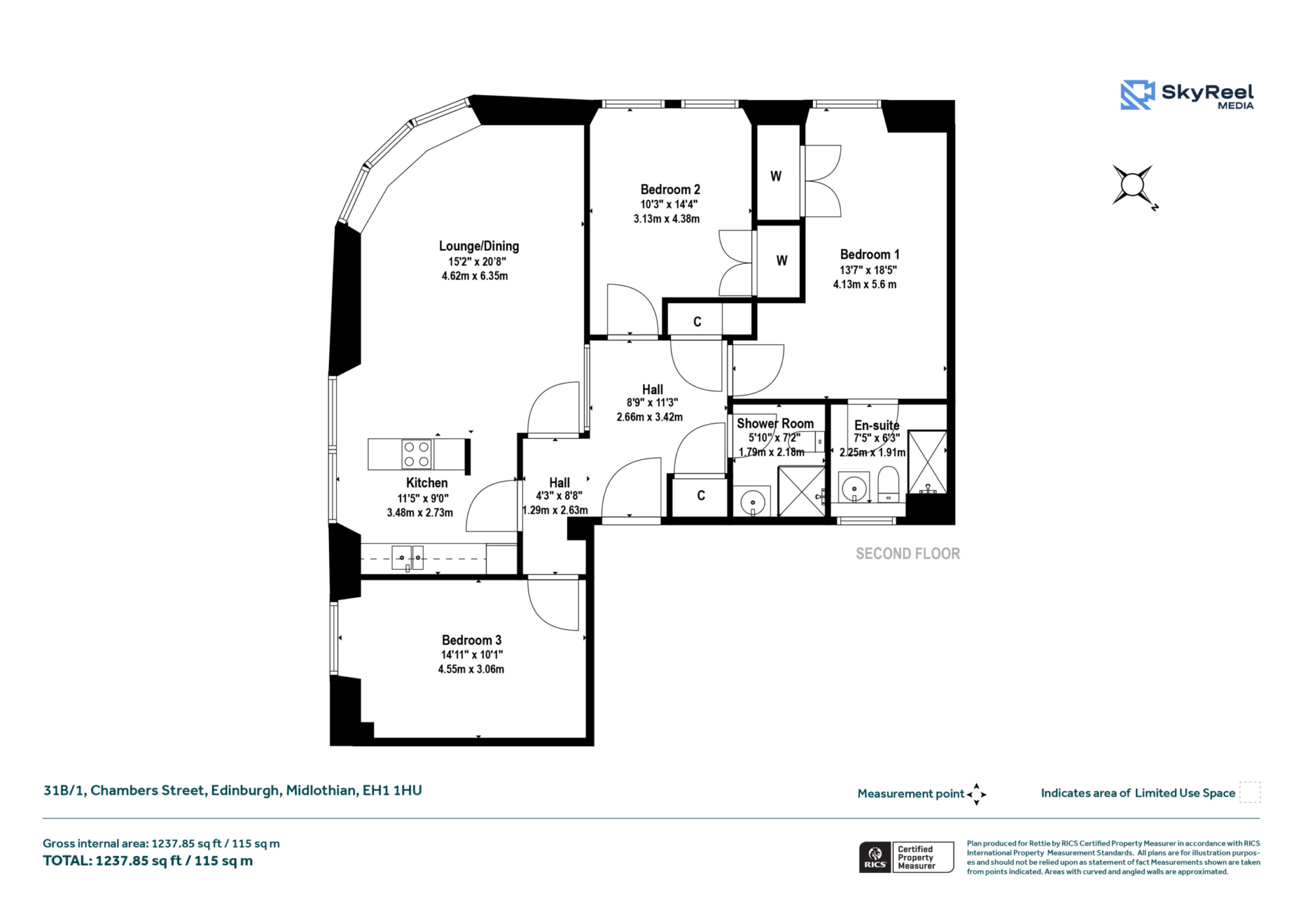 31B/1 Chambers Street is an exceptional three‑bedroom, two‑bathroom apartment forming part of the iconic former Dental Hospital at the top of Chambers Street, perfectly positioned on the second floor. Offering a generous 1237sqft of well‑designed accommodation, the property features a welcoming hallway leading into a superb lounge and dining room with a distinctive angled bay section that floods the space with natural light. The modern fitted kitchen sits conveniently off the main living area, while the principal bedroom provides extensive built‑in storage and a private en‑suite shower room. A further two double bedrooms, one particularly spacious and located off the secondary hallway, offer excellent flexibility for guests, family or workspace use, complemented by a contemporary shower room and multiple built‑in cupboards throughout.