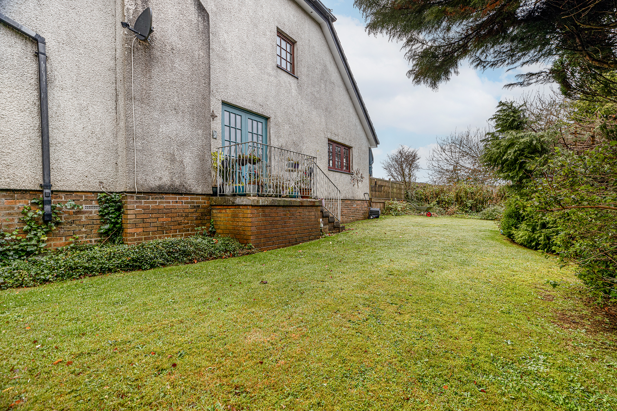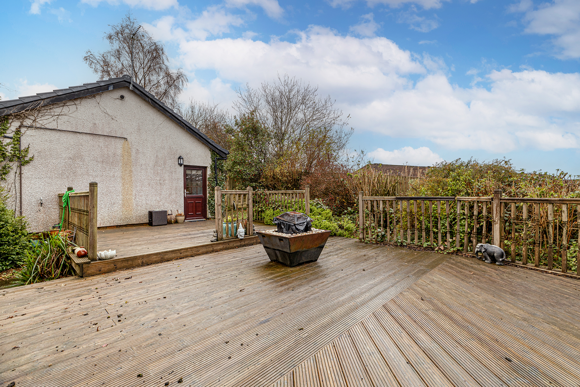 The extensive garden grounds include level lawned and decked areas, as well as a sloped wooded section, offering both usable outdoor space and natural beauty.