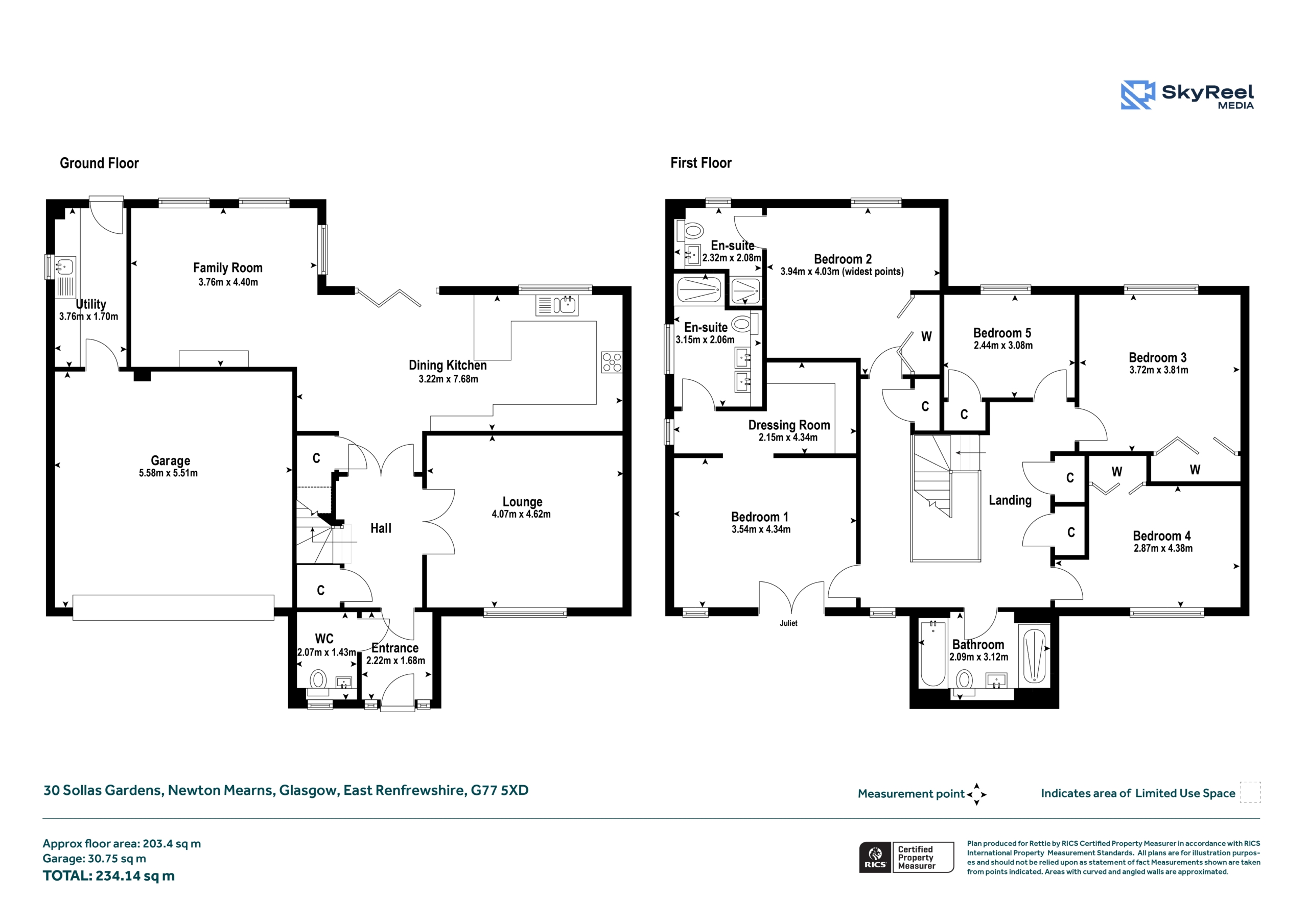 Upstairs, the galleried landing introduces five spacious bedrooms, each tastefully presented. Both the principal and guest bedrooms benefit from their own en-suite shower rooms, while the family bathroom is finished with a high-spec four-piece suite including a separate shower enclosure.