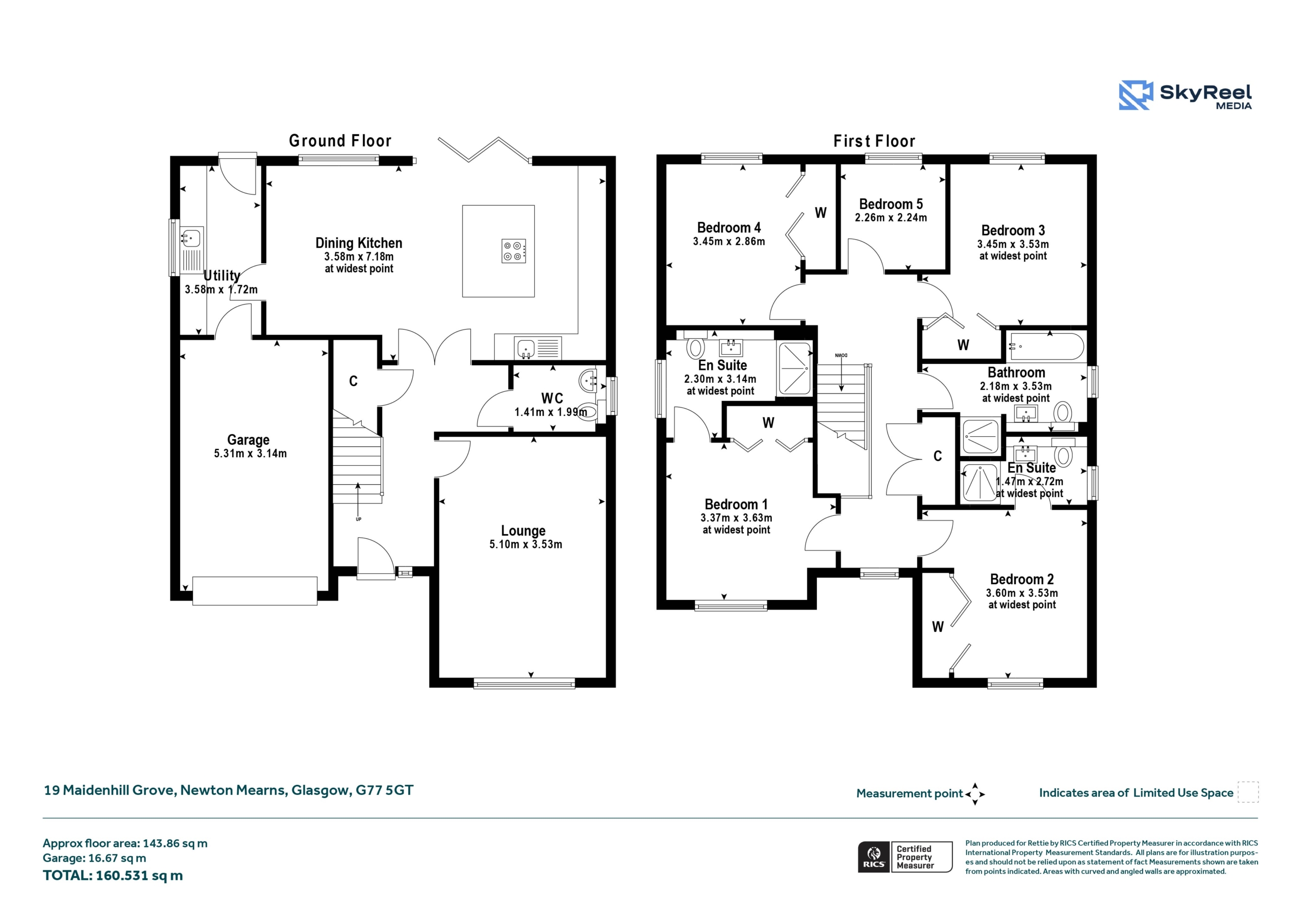Upstairs, a bright and spacious landing leads to the luxurious principal bedroom with fitted wardrobes and en-suite shower room. A second double bedroom also benefits from an en-suite, while two further double bedrooms with fitted storage and an additional fifth bedroom complete the upper floor.