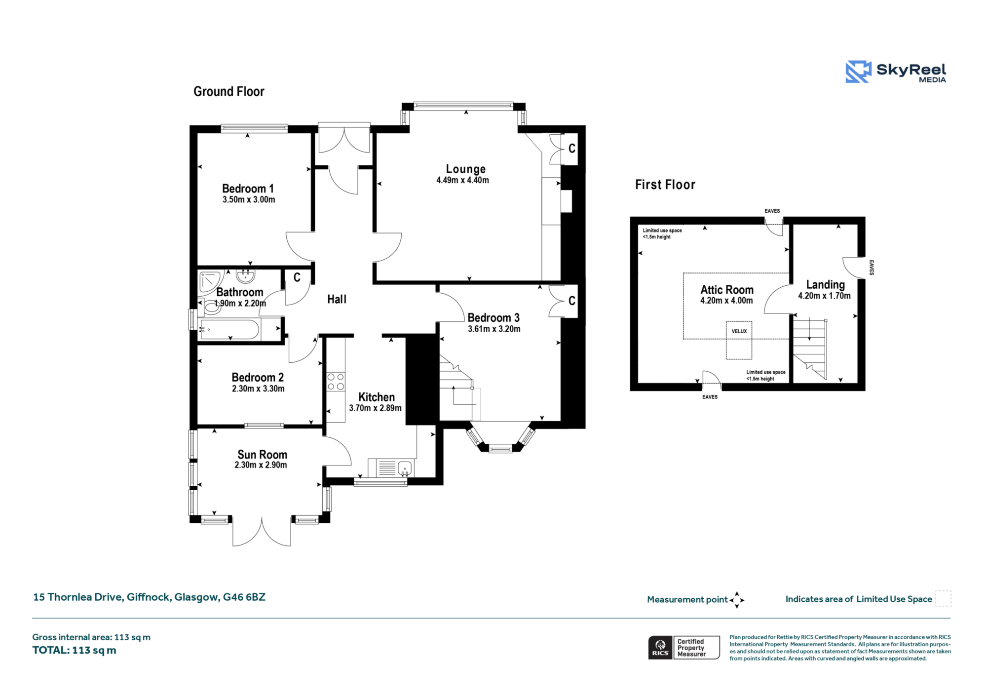 There are three bedrooms on the ground floor, two of which are comfortable doubles, with a third room well suited as a single bedroom, study or nursery. A bathroom with shower enclosure completes the lower level. The upper floor features a floored attic space, currently used as an additional room or flexible living area, accessed via a small landing and offering further scope for enhancement.