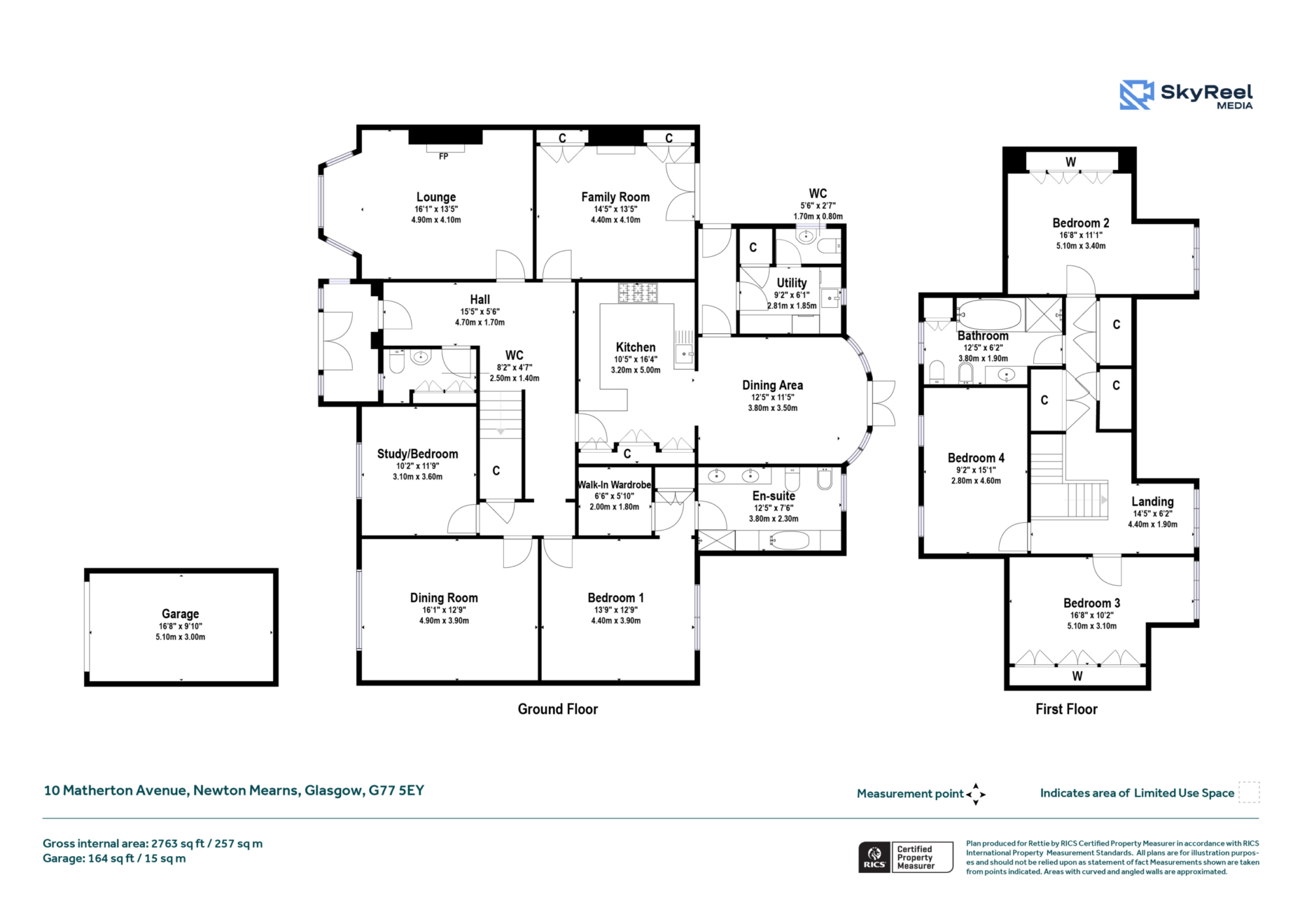 The ground floor welcomes you with a bright and inviting hall leading to an elegant well proportioned lounge with a bay window and feature fireplace, perfect for relaxing or entertaining. A separate family room with bespoke cabinetry and fireplace provides additional living space, French doors lead into the garden. The stunning bespoke kitchen with granite worktops sits at the heart of the home, seamlessly connecting to a generous dining area with a feature bay window, bringing in light and giving access to the patio, ideal for al-fresco dining. This area is complemented by a utility room and convenient garden toilet. The property boasts a luxurious principal bedroom with walk-in wardrobe and a six-piece en-suite with marble counter, complemented again by bespoke joinery. A formal dining room adds further versatility, alongside a study/bedroom for those working from home or for further accommodation. The ground floor is completed with an attractive cloakroom with a WC and wash hand basin.