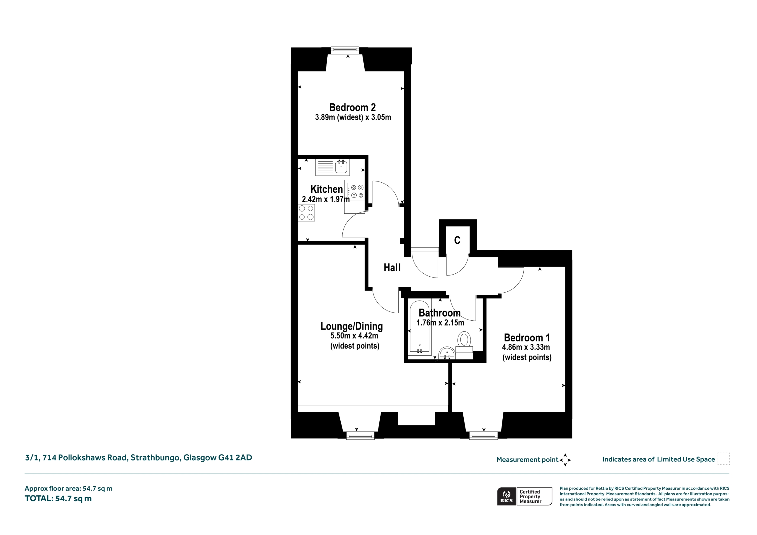 The accommodation of the flat itself comprises welcoming reception hallway with cupboard off, lounge with useful dining area, kitchen with a range of base and wall mounted units and tiled splashback, two double sized bedrooms both of which could be utilised flexibly as home office or study space and tiled bathroom with white three piece suite and over-bath electric shower.