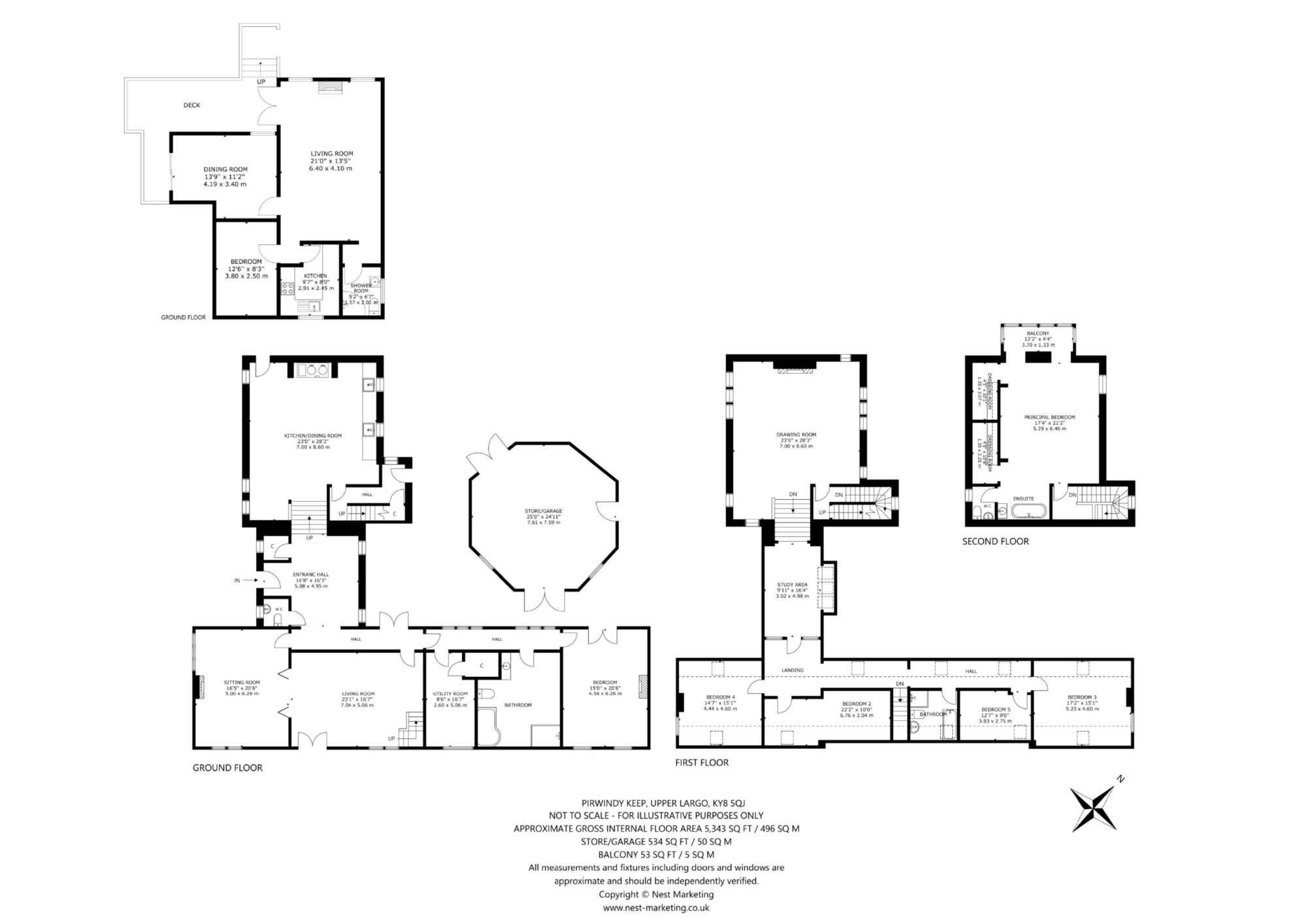 Built to an exacting standard in 1998 in the architectural style of a fortified turreted keep, Pirwindy Keep is a magnificent East Neuk country house that offers a unique and luxurious setting for family life. Generously proportioned and boasting high-quality finishes throughout as well as spectacular views of the landscaped gardens and surrounding countryside it is truly exceptional. Passing through grand stone pillars, a cobbled driveway curves gracefully through landscaped gardens, arriving at the front of the property and its impressive stone façade. The entrance, framed by manicured borders and mature trees, opens into a charming hallway laid with flagstone flooring, immediately setting a tone of character and warmth. This welcoming space provides access to a cloakroom and guest WC, while stone steps ascend to a dining kitchen. Evoking the rustic charm of a traditional country home, the kitchen is centred around a striking cream four-oven AGA set into an exposed stone recess. Twin Belfast sinks and ample worktop space complete this inviting space, which enjoys direct access to a west- and south-facing terrace ideal for alfresco dining and entertaining. To the right of the entrance hall, a light-filled south-east-facing sitting room flows into an adjoining family room through elegant bi-folding doors. This thoughtful layout allows the space to function as an expansive open-plan entertaining area or two distinct rooms for day-to-day comfort. A peaceful retreat, the carpeted sitting room is decorated in soft neutrals and features an open fireplace. The family room, currently arranged as a home cinema with an Optoma projector and screen, continues the stylish yet relaxed feel of the sitting room and opens to the side of the house. Beyond, a second hallway, enhanced with elegant wooden flooring, leads past a practical utility room to a luxurious ground-floor bathroom and a spacious bedroom. Double doors open from the bedroom onto a patio with views of a bluebell meadow and the charming timber bridge. Designed with a contemporary aesthetic, it features a countertop washbasin, a Victory Jacuzzi round bath, a separate shower enclosure, and a hidden cistern wall-hung WC. Ascending to the upper floors from both the kitchen corridor and family room, the home continues to impress. The drawing room located within the tower-like keep is a spectacular space, encircled by windows that frame panoramic views of the countryside. A large open fireplace set into an exposed stone wall and decorative timber panelling adds grandeur. From here, a connecting hallway, illuminated by three Velux windows, and base lighting offers an ideal study or reading nook and leads to a corridor hosting four double bedrooms and a well-appointed modern family bathroom with a freestanding bath and separate shower. On the top floor, the principal suite is a luxurious and private retreat. Encompassing two dressing rooms, a freestanding bath, an en suite WC, and a serene sitting area, it provides the perfect vantage point from which to enjoy the breath taking landscape in seclusion and comfort.