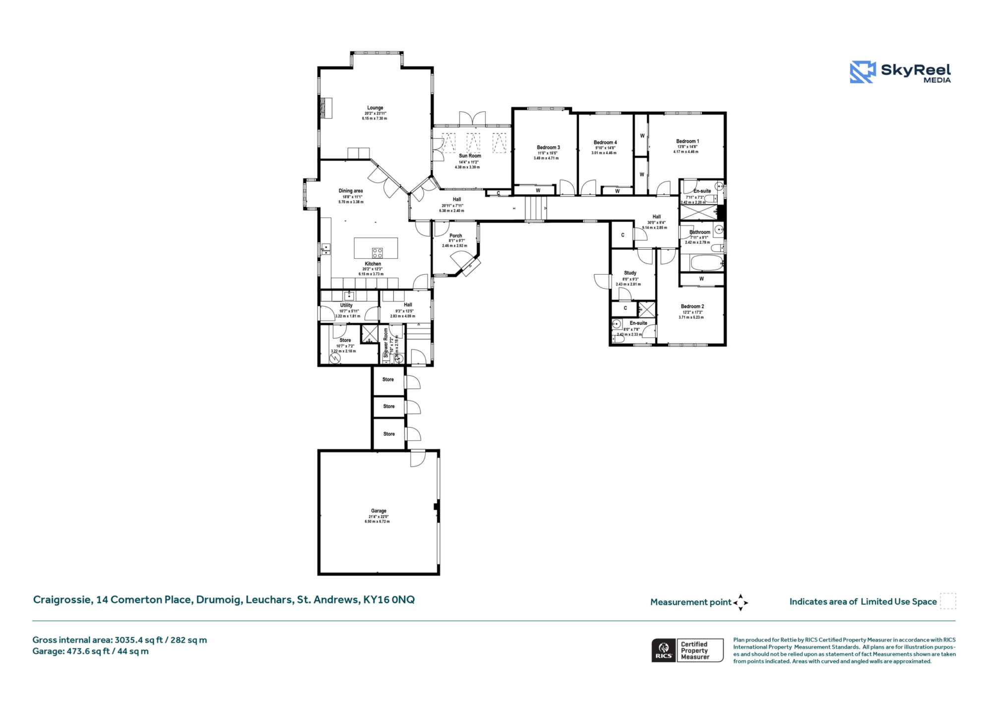 A long, wood‑floored hallway leads to the bedroom wing, comprising two well‑proportioned double bedrooms with built‑in wardrobes and modern en‑suite shower rooms, two further double bedrooms, a stylish family bathroom, and a dedicated study. The home combines modern comfort with an attractive setting, making it an ideal opportunity for those seeking flexible single‑level living in close proximity to St Andrews.